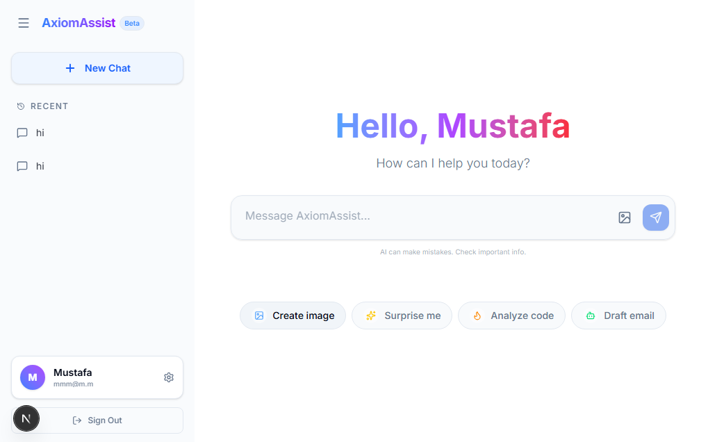 I'm AxiomAssist, here to chat, laugh, and help you out! 🚀From solving problems to just hanging out, I'm always here for you.